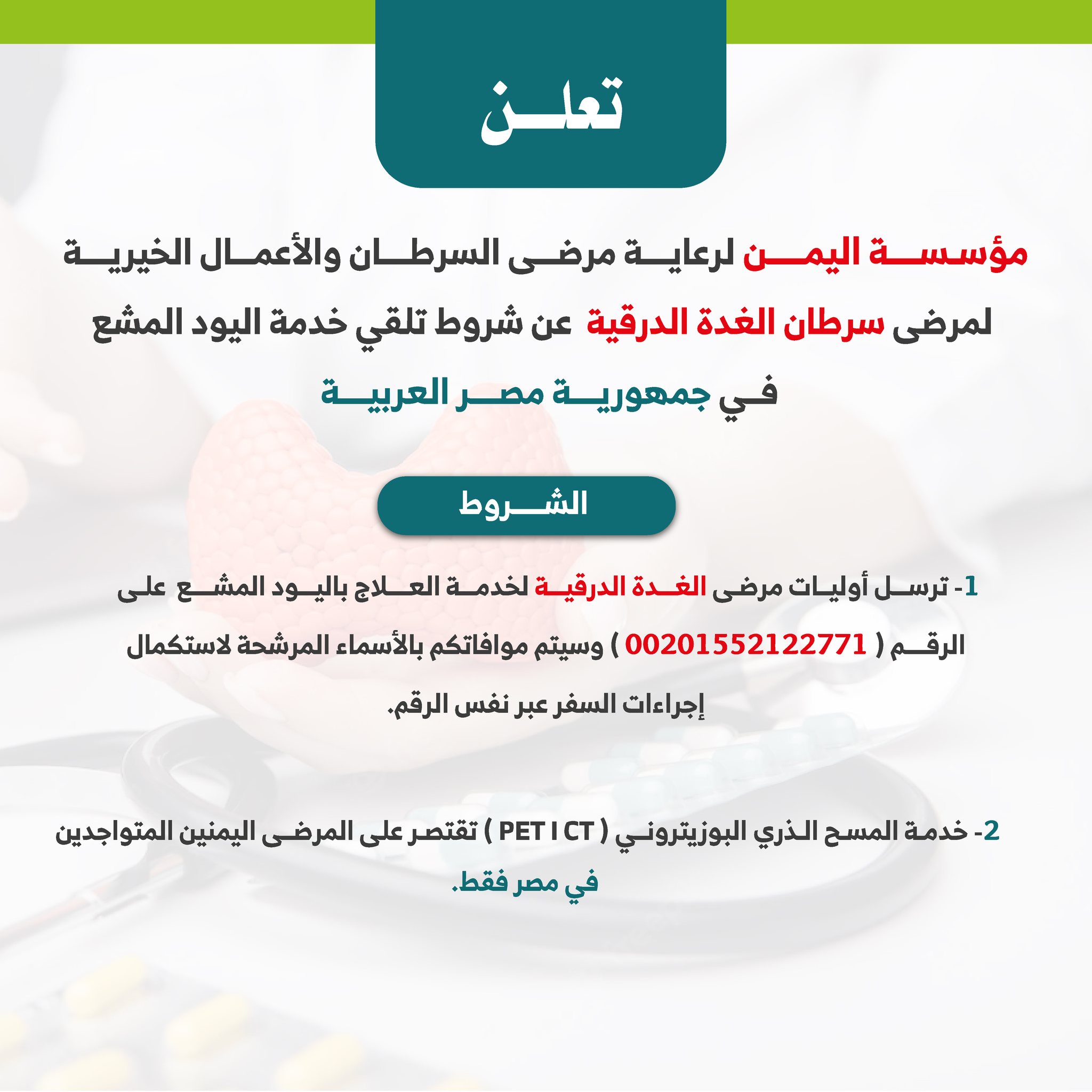 تعلن مؤسسة اليمن لرعاية مرضى السرطان والأعمال الخيرية-مصر لمرضى سرطان الغدة الدرقية عن شروط تلقي خدمة اليود المشع والمسح الذري للمرضى اليمنيين في جمهورية #مصر العربية
