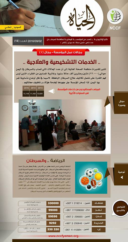 دار يجسد كل معاني القيم الإنسانية النبيلة ، ويحتضن الأمل والألم والبسمة والدمعة وكثيرا من المتناقضات ، دار الحياة لرعاية مرضى السرطان بصنعاء التابع للمؤسسة... Continue reading